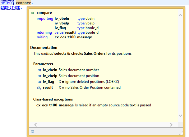 Until now, an integration concept that allows users to place example programs in ABAP Doc does not exist either. Hence, it may be advantageous to some programmers to continue to document classes in the classical ABAP class builder. In ABAP Doc’s current release state, it may be a good documentation tool for developers who do not use the classical class builder for their documentation requirements.