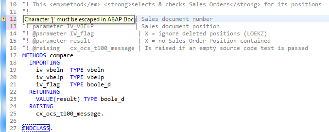 The name of an existing exception or parameter must be specified after the use of @parameter, @raising, or @exception. The exception or parameter should be followed by the documentation, which is separated by the “|” characters. This documentation is then completed by the next use of @parameter, @raising, @exception, or by the end of the ABAP Doc comment. Additional documentation or interface documentation cannot be inserted after the interface documentation, and every exception or interface parameter can only be used once.