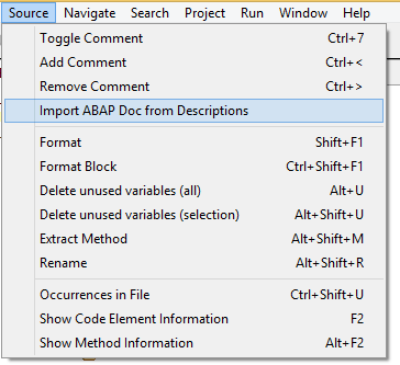 You can also generate ABAP Docs by opening the class or interface and selecting the Source > Import ABAP Doc from the Descriptions menu option. After you select Source > Import ABAP Doc from Descriptions, you can import existing interfaces and global class descriptions, including their methods, parameters, and attributes. An example is shown in Figure 18. After making the selection, the system imports the required documentation lines for the parameters as well as the options for the methods.