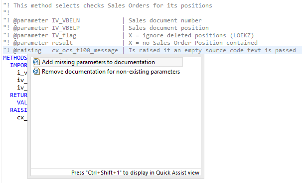 New templates for all undocumented parameters and exceptions can be generated within an ABAP Doc comment block through quick fixes, such as (Ctrl+1).