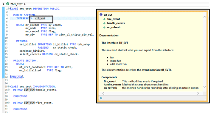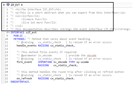Like Javadoc, ABAP Doc can be used to write documentation directly within source code through the use of special comments placement in front of a declarative statement. Artifacts that are available globally, such as classes and the methods and attributes of interfaces, can be documented along with local artifacts, such as local variables.