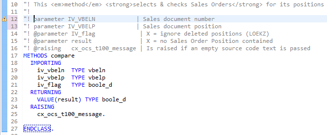 An ABAP Doc comment (a line or a block of lines) is introduced by the “! character string combination, which is a special form of a normal line-end comment. It must be located directly in front of a declarative statement. The horizontal arrangement of ABAP Doc comments must follow the source code indentations, and end-of-line comments are to be placed only after a concluding or declarative statement.