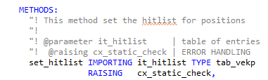 Parameters and exceptions can also be documented for methods, function modules, events, and form routines. The syntax shown in Table 1 should be used.