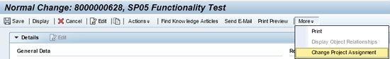 Now, normal changes can be easily reassigned to another maintenance project directly within the normal change document via the Change Project Assignment option within a normal change created in the CRM Web UI interface in Solution Manager (Figure 2). This functionality is not relevant for urgent changes.