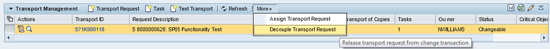 To decouple a transport request highlight the request and select the option More > Decouple Transport Request from the Transport Management assignment block (which you can find by scrolling down on the normal change) as shown in Figure 3.