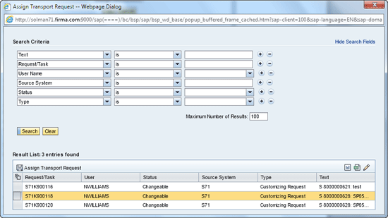 You then have several options for searching for the transport request as shown in Figure 6. Highlight the appropriate transport request and click the Assign Transport Request button.