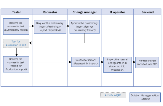 With SP05, preliminary imports to the production system can be requested directly within the normal change document. I’ve decomposed the process for the preliminary import in Figure 8. The main text within the box identifies which action must be selected within the normal change document. The text within italics identifies the status that the document goes into after each action is executed.