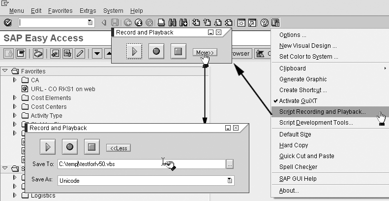 When you click the option Script Recording and Playback …, the SAPGUI starts the Record and Playback menu (Figure 11). Before you start recording a session, make sure you are on the main R/3 (Session Manager) screen. You can verify this by checking the transaction by clicking the pull-down menu on the right side of the status bar. Click on the More>> button on the Record and Playback menu and specify the name and location of the script file you want to save. The button text changes from More>> to <<Less when you click it. In SAPGUI version 6.20, a prompt for a file name is given after recording ends.