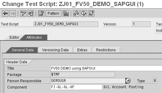 Create an eCATT test script via transaction SECATT. Choose the option Test Script and enter a name for the test script, such as ZJ01_FV50_DEMO_SAPGUI in my example. Click on the Create Object button. This leads to the Attributes maintenance screen of the test script (Figure 2).