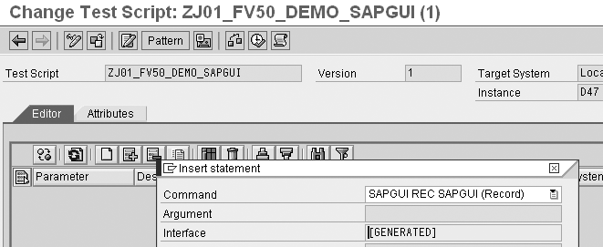 Next, choose the Editor tab of the test script. For my example, I’m using the new command interface SAPGUI, which enables me to record SAP transactions with a control framework such as FV50. Click the Pattern button and choose the Command as SAPGUI REC SAPGUI (Record) from the drop-down list Command Interfaces as shown in Figure 3. Click the enter icon to continue.