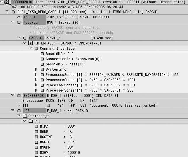 Accept the default command interface name (i.e., MSG_1 and E_MSG_1). Insert the LOG command with interface E_MSG_1 at the end to display the messages generated in the log. Execute the script ZJ01_FV50_DEMO_ SAPGUI to test the new commands. This time the log shows the messages generated by the transaction under the command LOG (Figure 7).
