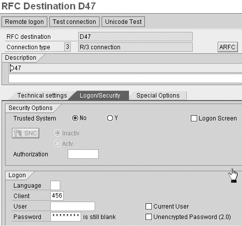 If the required destination (the target system for testing security) is not available, then establish it as follows: Enter the RFC destination name, description, and connection type as 3 and click on the enter icon. On the Technical settings tab in the Target Host field, enter the name of the application server with the appropriate system number next to it. Enter a Client value on the Logon/Security tab. Do not mark the indicator Current User or save a password (Figure 8).