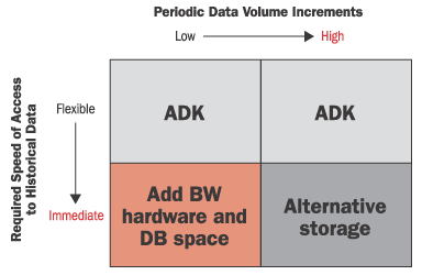 Several options exist for handling this design conundrum, and BW administrators must select the appropriate proven, durable and affordable strategies to keep their aged data readily accessible to users. These options include augmentation of the BW hardware/software infrastructure, the SAP ArchiveLink tools, the SAP Archive Development Kit (ADK), and external “alternative storage” solutions.