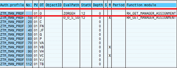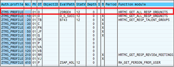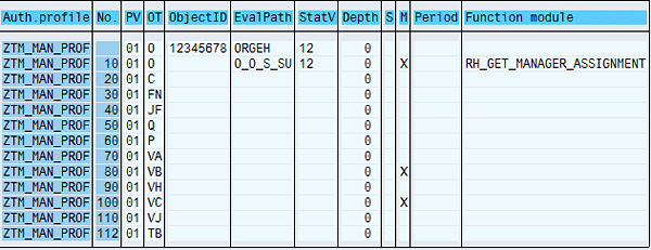 Evaluation path ZORGEH (Figure 17) starts from the responsible organizational unit for users and then moves upward in the line of hierarchy; therefore, the authorizations do not include other organizational units in their authority. Note that function modules RH_GET_MANAGER_ASSIGNMENT and HRTMC_GET_ALL_RESP_ORGUNITS find the responsible organizational unit for managers and TMS users, respectively.