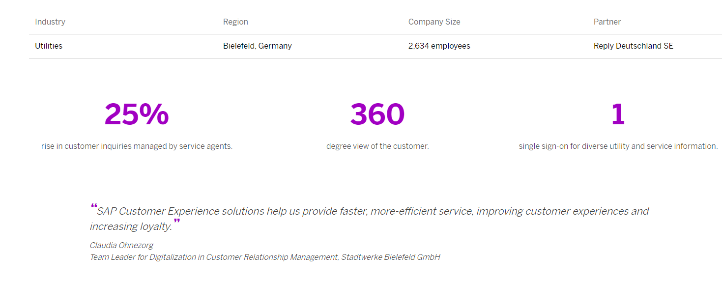 SAP Customer Experience portfolio. SAP partner and utilities specialist Reply Deutschland SE provided expert guidance and implementation support, offering preconfigured templates to help deliver a smooth and rapid migration.
