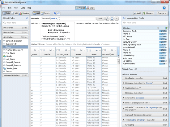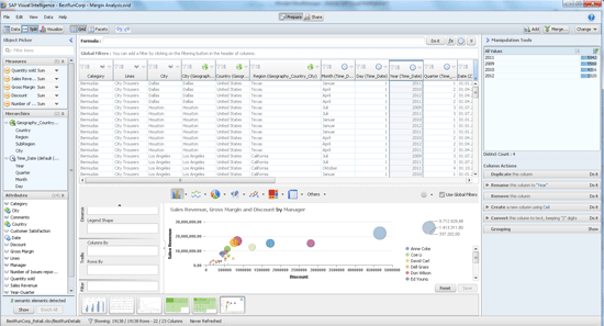 Business analysts rarely find the data exactly in the way they need it. Before they start visualizing data, they normally need to tweak it a bit. This includes cleansing, correction of typos, grouping, trimming, adding calculations, and more. SAP Visual Intelligence supports this with a drop-down menu on each column for basic operations, filters, sorts, manipulation tools, and a formula editor.