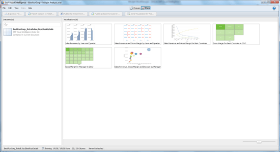 SAP Visual Intelligence saves your work in documents having file extension *.svid. These documents contain all of the visualizations you create from one or more data sources as well as local datasets containing a copy of all data. The navigation pane on the left side of the start screen provides lists of all your documents, data sets, and visualizations and lets you open the respective document via a mouse click. The Samples link in the left pane provides sample datasets and visualizations to learn from. I recommend watching the videos first, then playing with the sample datasets, and you’ll be ready for your first productive use of the product with your own data in your own business context.