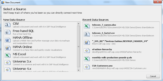 Click the New Document button in Figure 2 to go to the screen shown in Figure 5, which shows the available options for data sources in version 1.0.7 when starting a new document in SAP Visual Intelligence.