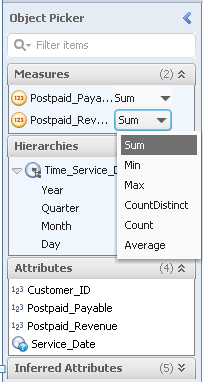 Semantic enrichments turn attributes into measures using the Object Picker. Measures are assigned an aggregation type such as Sum, Min, Max, CountDistinct, Count, or Average. This is how they show up in visualizations. For example, let’s choose Sum for the measure Postpaid_Revenue as shown in Figure 9. Then, that measure is visualized in combination with attributes such as Customer_ID always as the sum of all revenues originating from the same attribute value, as opposed to minimum, maximum, or average value. To learn how to create the visualization in combination with Customer_ID, see the section below, Visualizing Your Data.