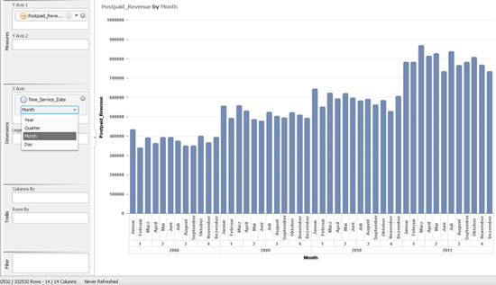 Using time hierarchies, revenue data can be visualized per year, quarter, month, or day