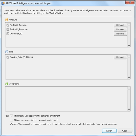 Visual Intelligence also proposes columns for data enrichment. Just click the Show button at the bottom of the Object Picker pane (Figure 3) and a pop-up shows all proposed columns for enrichment (Figure 12). You can remove columns if they are not adequate for enrichment, and then click the Enrich button to enhance the selected columns. In my example, the column Customer_ID may not be needed as a measure, unless you want to count distinct customers. Here’s another case: You may not find all columns in your data source that contain dates suitable for creating time hierarchies; you may need only the column stating the revenue date as a time hierarchy, but not the Last Saved column/