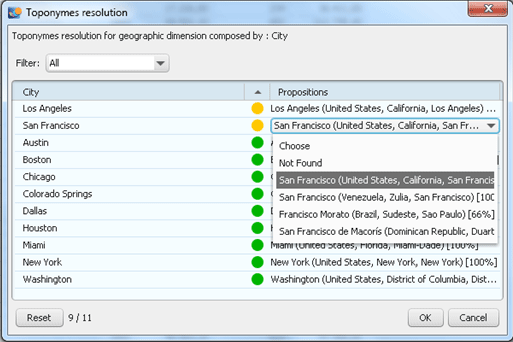 In the case of ambiguities, select the right location from a drop-down list (Figure 13). The system automatically detects ambiguities and shows them. For example, there is more than one San Francisco in the world, and you need to select the one that belongs to your data.