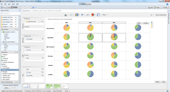 Creating visualizations is easy. You drag and drop measures and attributes from the Object Picker either right into the visualization pane in the center, or into the Chart Feeder next to the Object Picker. You do not need to do anything to activate the Chart Feeder. It is always part of the visualization view. There are four different feeder areas: measures, dimensions, trellises, and filters. Figure 14 shows an example for a trellis by column and by row. The same pie chart is repeated for data from four different years and six different product lines.