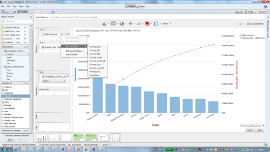SAP Visual Intelligence can sort and rank the data in charts and add calculations to charts such as running sums, minimum, maximum, counts, averages, and moving averages (Figure 15).