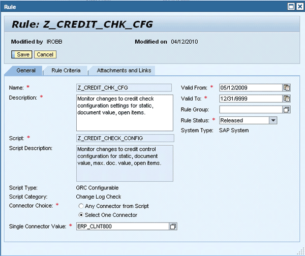 Each rule refers to one rule script and contains rule criteria that detect low, medium, and high deficiencies for issue generation. You create rules by following menu path Global Compliance Office > Global Evaluation Setup > Automated Test Rules > Rule. In the General tab, provide a name and a description for the new rule and choose one of the previous rule scripts (Figure 5). Your selection automatically populates the following fields: Script Description, Script Type, Script Category, Connector Choice, Single Connector Value, and System Type.