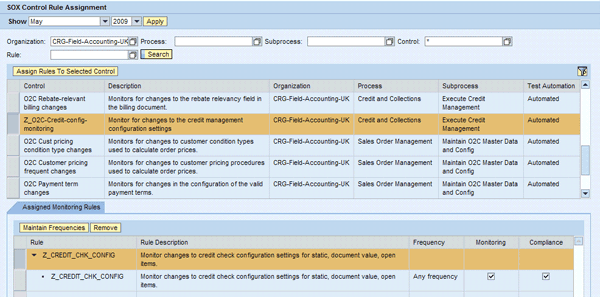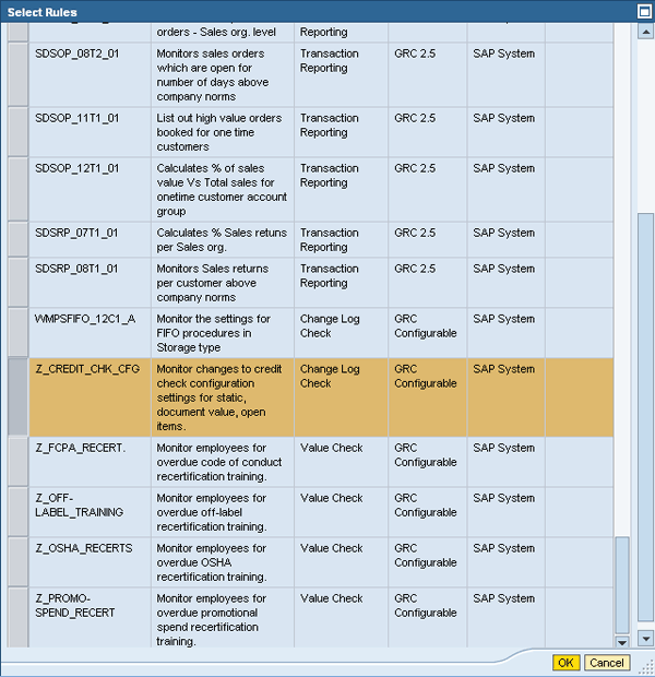 The third step to control automation is the assignment of one or multiple rules to a control in the context of the specific compliance initiative. Navigate to the Evaluation Setup workset within the given compliance initiative. For example, follow menu path SOX > Evaluation Setup > Automated Test Rules > Control Rule Assignment. This opens a screen to select organizations, processes, subprocesses, controls, and rules. When you click Search, the system displays the controls in the upper part of the screen and the already-assigned rules with the associated rule script in the lower part of the screen (Figure 7). Select a control and a rule and click Assign Rules To Selected Control. This opens a window with all available rules from which to select. Select one or multiple rules and click the OK button (Figure 8). Then select one or multiple frequencies for monitoring and compliance for each new rule assigned to the control in the lower part of the screen in Figure 7.