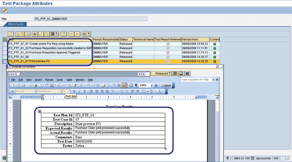 The tester then executes each test. Once the transaction associated with the step is executed, the tester documents the results by clicking the Attachments button (Figure 13). The traffic lights to the right of each step indicate the test results. In this case, the test passed. PTP_01_05 and PTP_01_07 indicate the steps that the tester needs to execute.