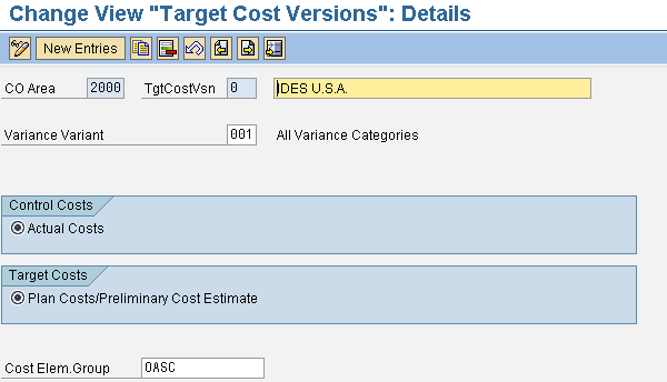 Target cost versions are used to determine the basis for target cost calculation. Target cost versions are used primarily to control the variance type (e.g., total, production, or planning) in variance calculation. They form the basis for calculating variances for a cost center, an order, or a cost hierarchy, and splitting the actual cost posted to a cost object hierarchy to individual product. You can configure target cost versions via transactions OKV5 (Figure 11), OKV6 (Figure 12), and OKV7 for cost centers, orders, and cost object hierarchy, respectively. The screen that transaction OKV7 produces is identical to Figure 12.