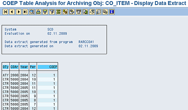 Program RARCCOA3 displays the number of entries in table COEP that you can archive via the CO_ITEM archiving object (Figure 17). Also, the report provides information about periods that have a table entry assigned.