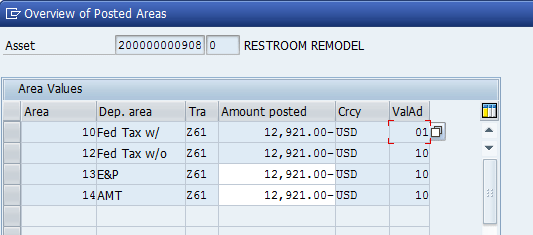 Next, I review the asset in transaction code AW01N to see that the posted values are successful. In Figure 4, you can see the posting you made via transaction code ABSO is now on the asset values screen. The transaction type Z61 is set up to update the Unplanned Depreciation section for the tax areas. One item to note is that the Z61 transaction type will show up in the Transactions section for other areas, but will have a value of 0.00 for the posting (Figure 5).