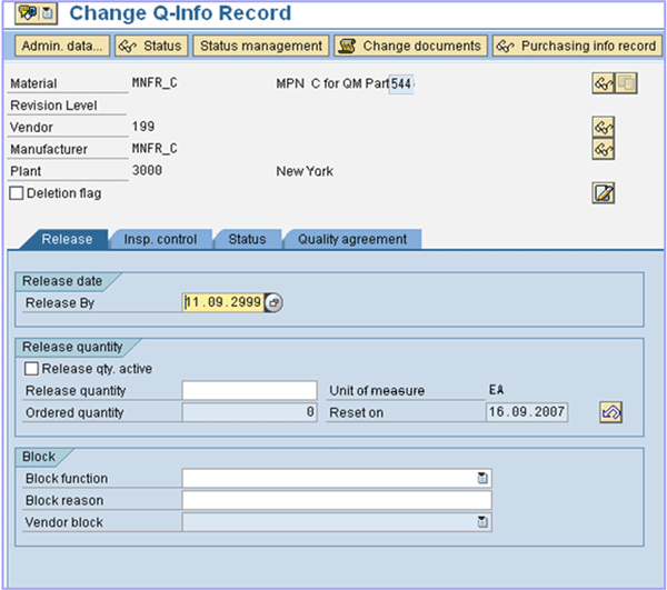 Step 3. Set up the MPN and create a quality information record (QIR) for it. Figure 11 shows how a QIR is created. The QIR is set up for an MPN, manufacturer and vendor. The QIR will then define whether the MPN, manufacturer, and vendor are active or blocked.  When a source (an MPN) has to be assigned to a requisition in transaction ME57 this MPN will be proposed as a valid source at the time of processing of a requisition.