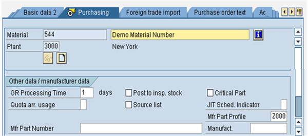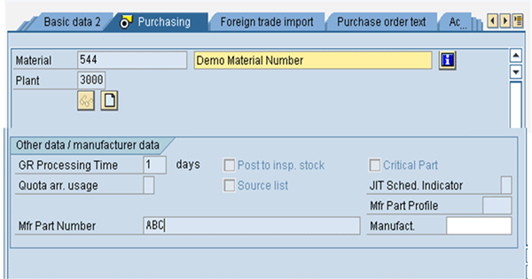 Step 2. In the inventory part number (Material number 544), the manufacturer’s part number is maintained as a free text field in the purchasing view (Mfr Part Number ABC). Â