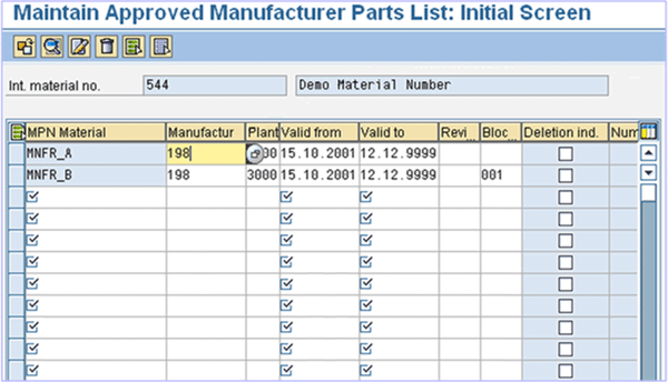 - AMPL (approved management part list) Management controls if the approved manufacturing part list is maintained or not and from where the MPN is procured (Figure 5). The inventory part number (Int. material no. 544) can be linked to the manufacturer (Manufactur 198) and the manufactured parts (MPN Materials “MNFR_A” and “MNFR_B”. The validity dates ( Valid from and Valid to) can be defined for the manufacturer and the MPN. If for any reason the manufacturer needs to be blocked, this can be done as well (Bloc 001), and then this MPN is not proposed as a source.Â