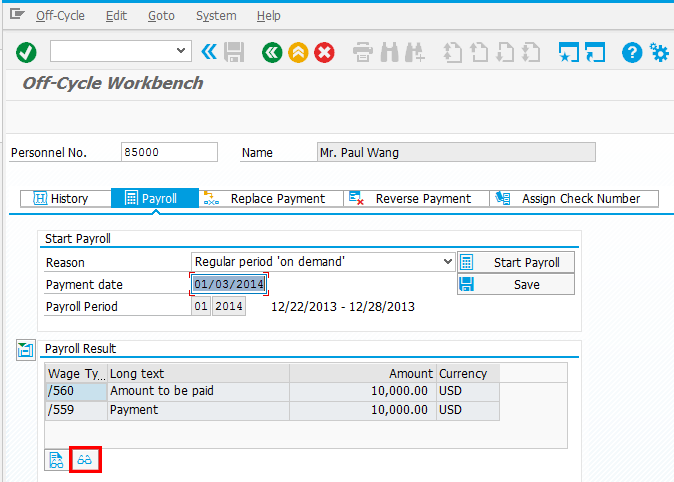 Execute transaction code PUOC_10 for the US Off-Cycle Workbench. In the screen that opens (Figure 1), enter the Personnel No. to process, select the Payroll tab, select the Regular period ‘on demand’ Reason, and click the Start Payroll button. This should run the payroll and you should now see the Payroll Result and an eyeglass icon (boxed in red in the figure). Click the icon to display the payroll log.