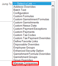 Once you are logged in, on the right side of the screen you should see the Jump To box with drop-down options (Figure 12). Select Manage Companies.