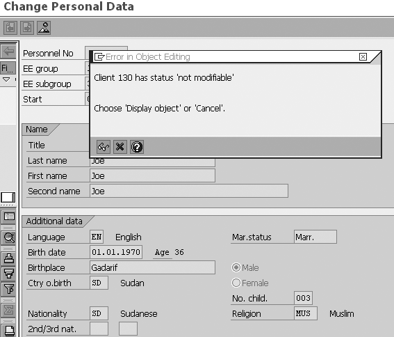 This problem occurs when you try to save changes or new employee records in the personal data infotype 0002 in PA using transaction PA30. Figure 1 shows the pop-up window with the error message Client 300 has status ‘not modifiable.’ The client number in the message reflects the client you’re using.