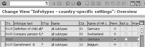 Next, delete the entry for infotype 0122 from table T582L. Enter transaction S_AHR_61011205 or follow IMG menu path Personnel Management>Personnel Administration>Customizing Procedures>Infotypes>Assign infotypes to countries. Click on the execute icon to see the screen in Figure 9. Scroll until you find infotype 0122, select it, click on the delete icon, and then click on the save icon (Figure 10).