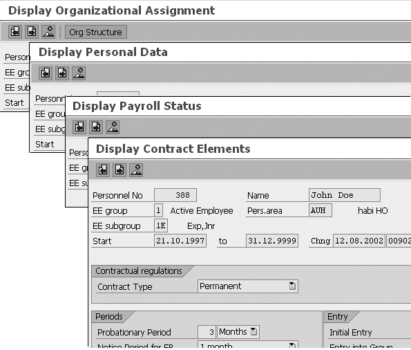 Now you may use the personnel file transaction (PA10) to scroll through an employee’s personnel file without seeing any error messages. The system displays all data stored for an employee in the various infotypes in ascending numerical order according to their validity periods (Figure 11).