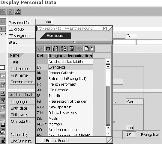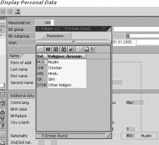 This results in incorrect personal data information when you display the personal data infotype. The incorrect information occurs because the religious field (KNOFE) in table PA0002 stored only the religion key value, not the religious description. For some employees, the religion key value stored in table PA0002 is 01, which means Muslim as customized in R/3 4.6C (Figure 14). After upgrading, the key value 01 in SAP ECC 5.0 means Evangelical, as shown when you display infotype 0002 for the same employee (Figure 15).