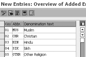 First, create new entries for same descriptions shown in Figure 16, but use different key values (e.g., 95: Muslim, 96: Christian, 97: Hindu, 98: Sikh, and 99: Other Religion.) You have 10 entries total and two descriptions for each religion, but with different keys (e.g., 01 and 95: Muslim, 02 and 96: Christian, 03 and 97: Hindu), which you can view using transaction (S_AHR_61011596).
