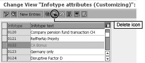 Double-click on first row, Infotype, to see the infotype attributes window shown in Figure 7. Scroll until you find infotype 0122. Select the 0122 row, click on the delete icon, and then click on the save icon (Figure 8).