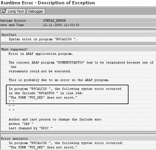 I’ll explain one of the payroll driver problems that you may need to solve after upgrading. This problem concerns a syntax/runtime error that occurs when you execute a payroll driver (e.g., RPCALCX0). This issue may occur with all payroll drivers. After I explain the reason for the problem and its solution, you will know how incomplete customization activities in R/3 4.6C may lead to inconsistency after you upgrade.