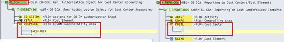 Figure 9 shows a typical cost center standard hierarchy. The hierarchy node enclosed within a box is the top node for all the cost centers within a company code (e.g., company code 1000). Those cost centers circled with a circle are the actual cost centers in that company code (e.g., 1110). Using authorization object K_CCA, you don’t need to maintain each cost center value one by one as you did with K_REPO_CCA (Figure 10). For K_CCA, maintain the node in the authorization value field responsibility area (RESPAREA). For K_REPO_CCA, you need to maintain the cost center value one by one in the authorization value field cost center (KOSTL). This shows that K_CCA is more flexible. For example, if a new cost center is created in the future, you don’t need to update the authorization value using K_CCA because the hierarchy node remains the same.