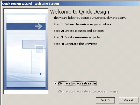 in the toolbar to start the Quick Design Wizard (Figure 20). Ensure the option Click here to choose strategies is activated, then click the Begin button.