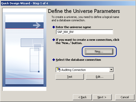 Step 4. Enter a name for the universe and click the New button to create a new connection (Figure 21). Click the Next button.