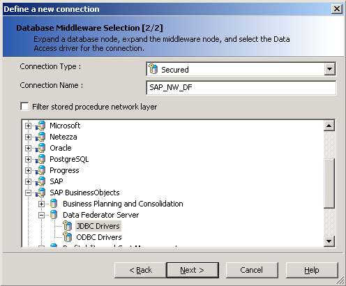 Step 5. Enter a name for the middleware connection and select the JDBC Drivers option for the Data Federator Server (Figure 22). Click the Next button.